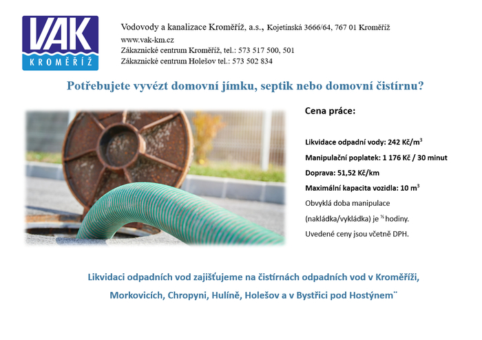 V případě, že Vaše nemovitost není připojena na veřejnou kanalizaci a odpadní vody jsou svedeny do jímky, je možné na základě objednávky odběratele zajistit vyčerpání a odvoz obsahu jímky. Stejně tak i čištění kanalizace tlakovým vozem. Služba je zpoplatněna dle ceníku VaK.